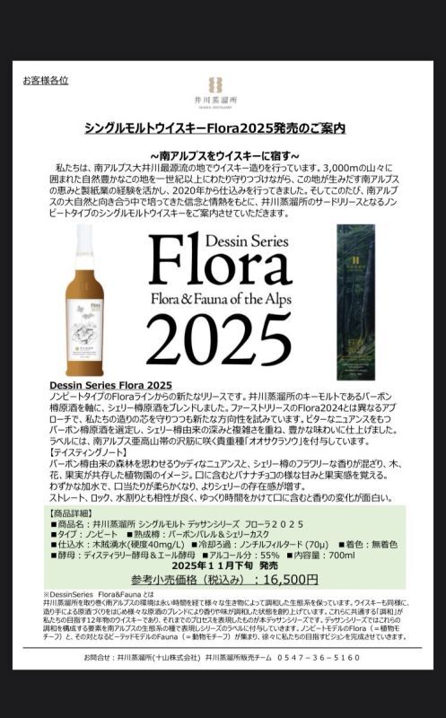 「Flora2025」という名のとおり、ラベルには蒸溜所が位置する南アルプス社有地に