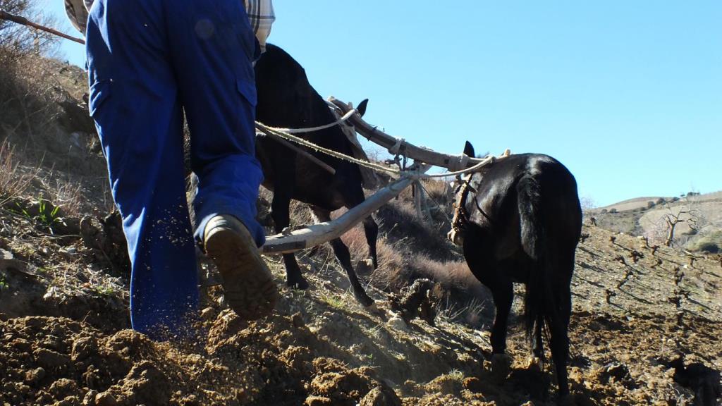 急勾配の畑は機械が使えず2頭のラバが活躍しており